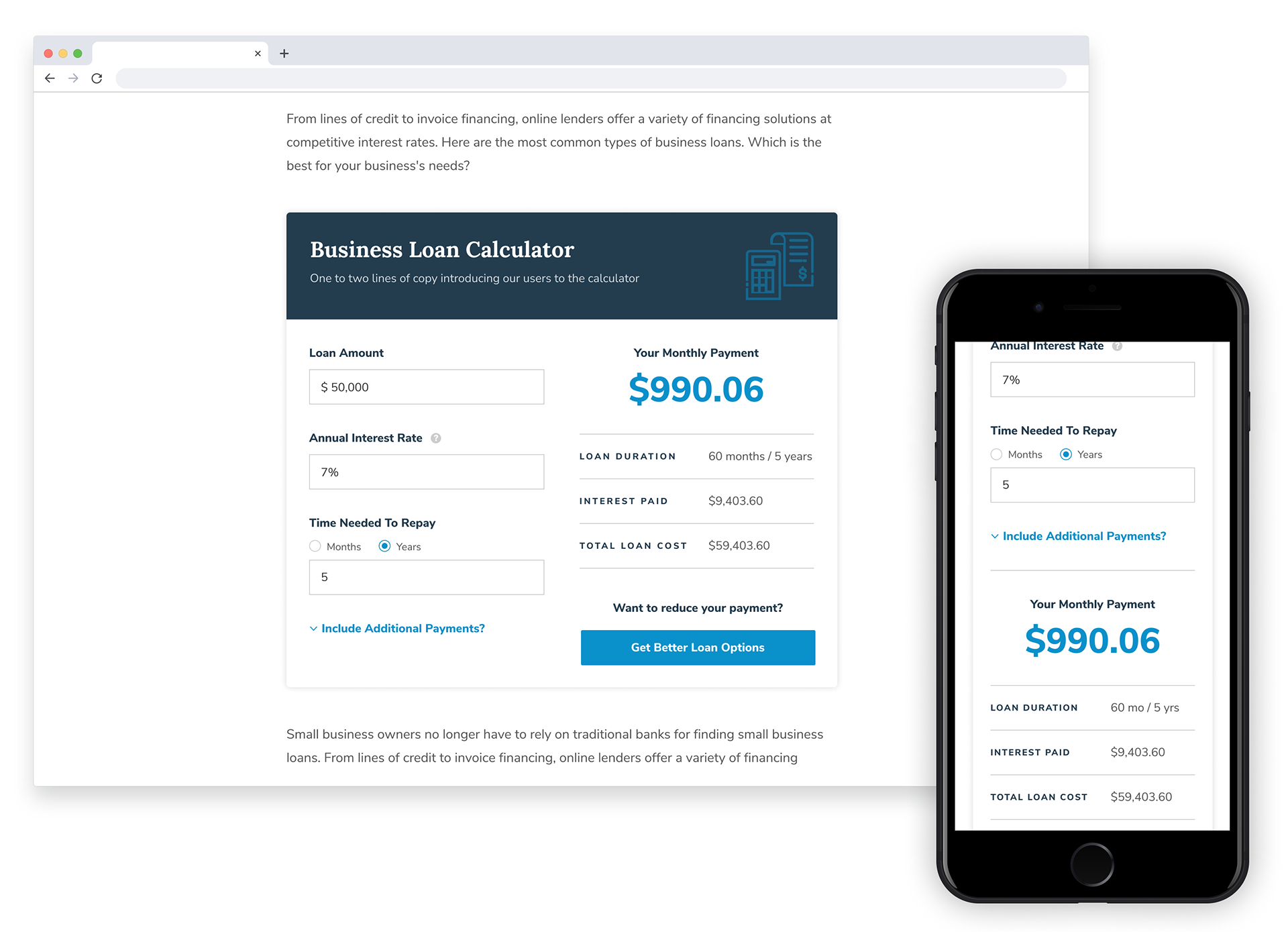 In addition to product comparison tools I additionally created scalable designs for interactive loan calculators that could be embedded throughout the site. Desktop, tablet, and mobile breakpoints were always taken into consideration while putting together these tools.
