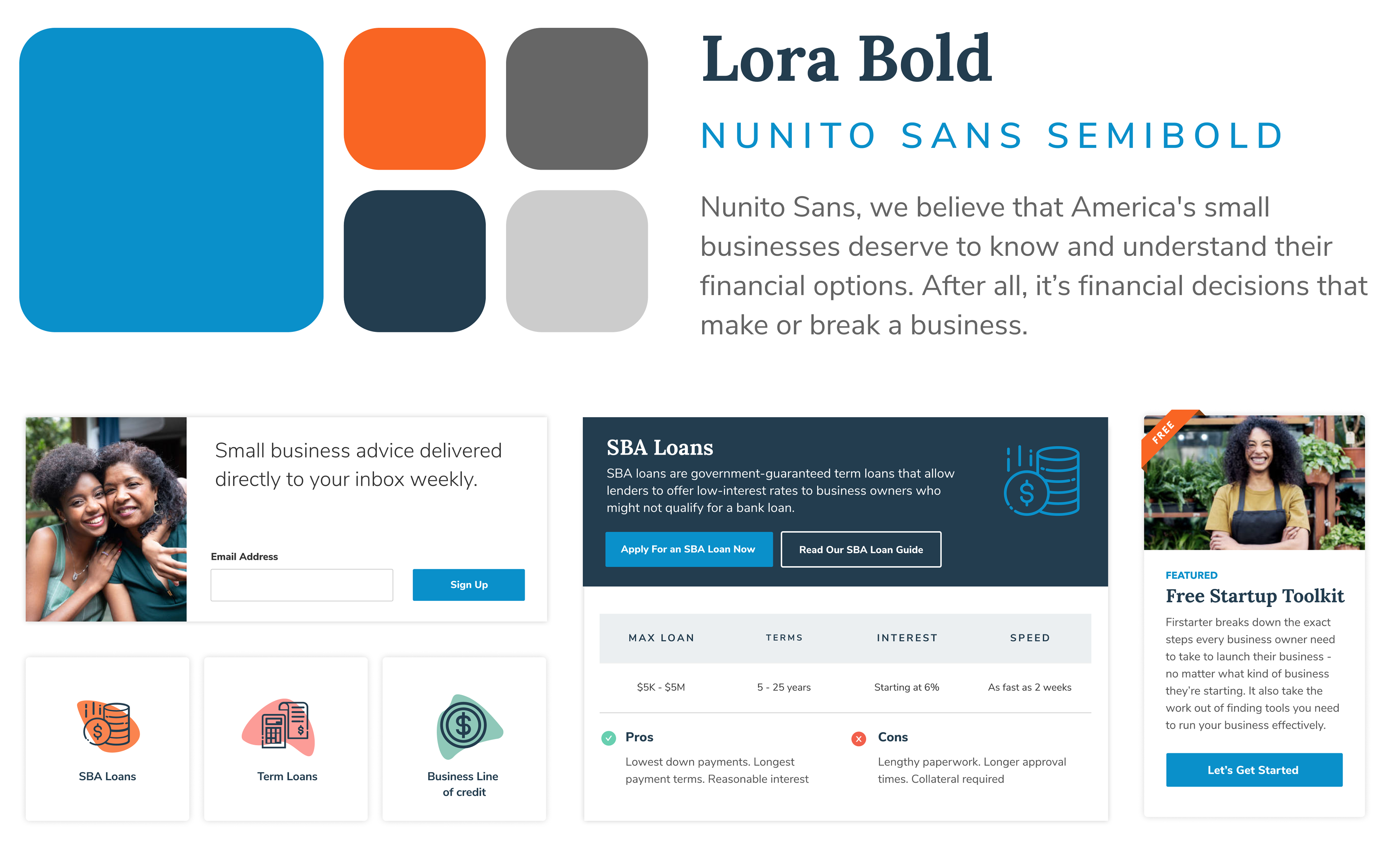 My initial task was to begin building out an updated visual identity system that would scale effortlessly across Fundera's vast library of content. Working directly with stakeholders and Fundera's product design team I put together a modern, simplified color palette, typographic system, and photo sourcing guidelines to help unify the look-and-feel of Fundera's content.