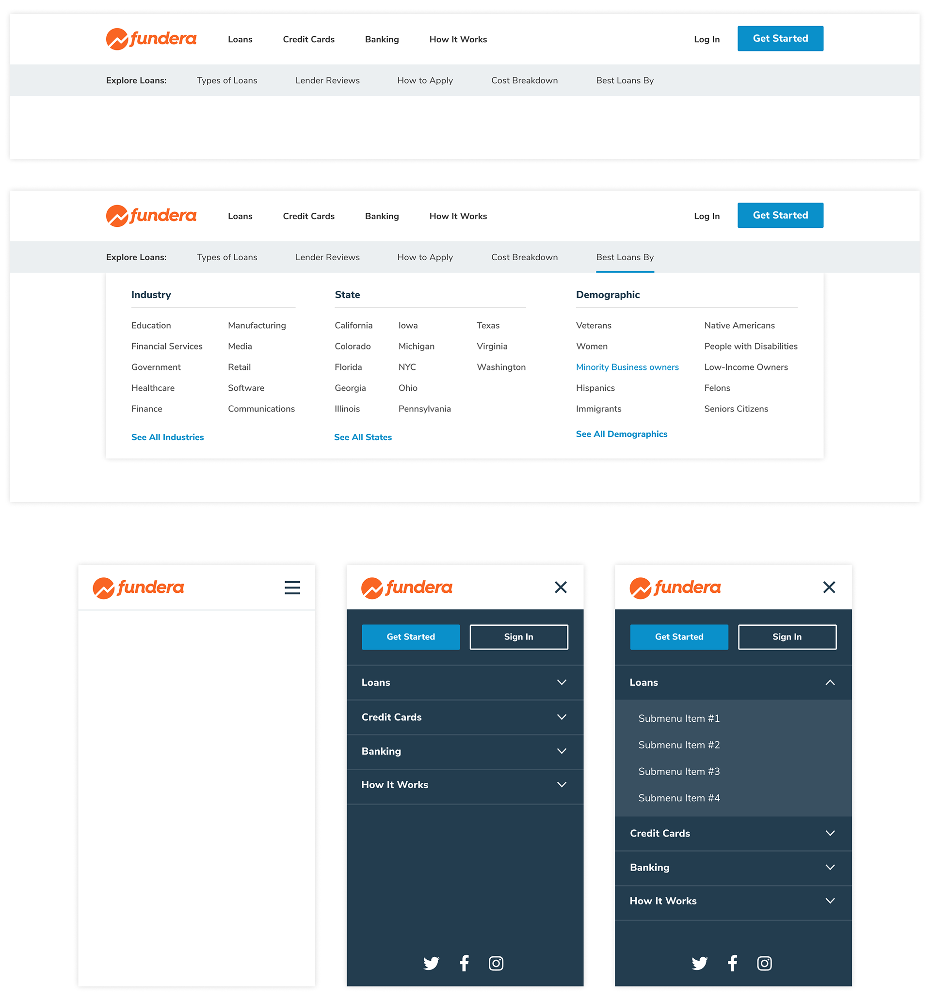 Updating Fundera's global navigation system was another important piece of this project. Empowering our users to easily access Fundera's enormous library of articles, guides, and reviews was of the utmost importance, so we built out a desktop and mobile navigation that is highly intuitive and accessible.